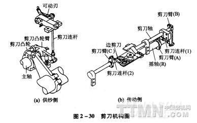 (2)傳動側剪刀機構(右側):安裝在織口前的邊撐桿前側。當緯紗的末端與捕邊紗交織后向織口方向移動抵達剪刀處,剪刀將緯紗剪斷,捕邊紗與布分離并被捕邊卷取機構回收到廢邊紗桶中。將大于布幅的多余緯紗從布邊上剪除的目的是使布邊整齊美觀。機構見圖2—30(b)。