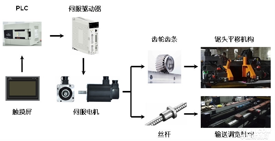 基本工作原理為:四方電氣CA100伺服系統通過齒輪齒條及絲桿分別帶動鋸頭平移機構和輸送調寬機構。鋸切位置和速度及輸送調寬的寬度由觸摸屏設置,通過Modbus通信發送至PLC,PLC再將位置及寬度轉化為控制伺服位置及轉速的脈沖信號控制伺服系統運行。脈沖的個數及頻率決定了伺服電機轉動的圈數(即鋸切位置和寬度)和運行的速度。