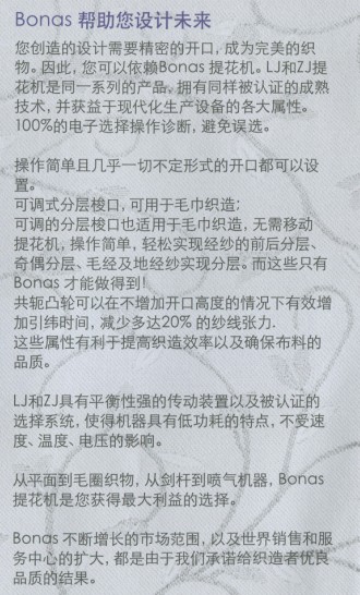 該產品具有可調式分層梳口,也可應用于毛巾織造,兩大優勢,只有在Bonas ZJ和LJ提花機上。
