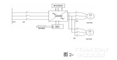 變頻器需要一拖二控制兩臺132KW的異步電動機充分考慮其啟動時要求的轉矩大,選用GD300-500G-4變頻器。直驅式壓力機需快速啟停,正反轉快速切換。下壓時(正轉)直接啟動,碰到下壓停止接近開關后自由停車,靠慣性打擊完部件后(有個反彈的力)輸出反轉信號,上升(反轉)轉速追蹤啟動,碰到上升停止接近開關后有效制動,完成一次打擊動作。整個變頻驅動系統的電氣接線如圖2所示。
