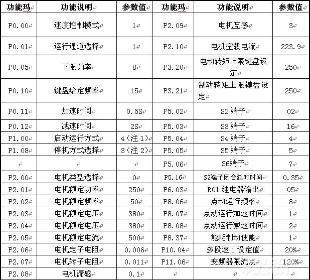 首先將電機參數輸入變頻器(功率是兩臺電機的總和,電流是兩臺電機的額定電流的總和),輸入后將P00.01改為0,通過P00.15改為2(靜態自學習),學習完畢后對參數表2上所述的參數一一輸入變頻器內。開始空載調試。