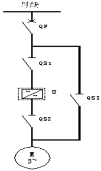 通過咨詢和現(xiàn)場分析,決定采用一拖一手動(dòng)旁路方案:主回路由負(fù)荷開關(guān)QF、3個(gè)高壓隔離開關(guān)QS1、QS2和QS3及高壓變頻器組成(如圖3)。其中要求QS2和QS3不能同時(shí)閉合,在機(jī)械上實(shí)現(xiàn)互鎖。高壓隔離開關(guān)QS1、QS2、SQ3加裝電磁鎖,電磁鎖的操作電源使用QF的輔助觸點(diǎn)閉鎖。只有當(dāng)QF斷開時(shí),QS1、QS2、SQ3的電磁鎖才能得電,可以正常操作。在變頻運(yùn)行時(shí),QS1和QS2閉合,QS3斷開,變頻器得電啟動(dòng)后,電機(jī)處于變頻運(yùn)行狀態(tài);工頻運(yùn)行時(shí),QS3閉合,QS1和QS2斷開,QF閉合后,電機(jī)實(shí)現(xiàn)工頻直接啟動(dòng),恢復(fù)改造前的運(yùn)行狀態(tài)。