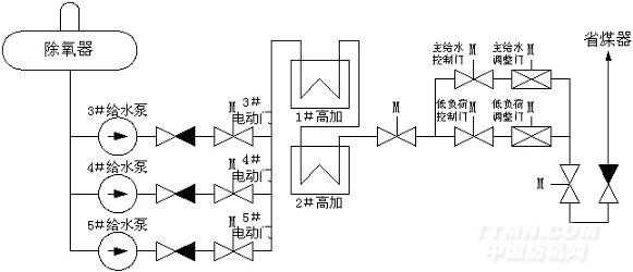 給水泵的任務(wù)是將除氧器貯水箱內(nèi)的具有一定溫度的給水,通過給水泵產(chǎn)生足夠的壓力打入汽包,汽包內(nèi)汽液分離,水送入熱鍋爐,在鍋爐環(huán)冷壁中加熱產(chǎn)生蒸汽后進(jìn)入蒸汽輪機(jī)作功,帶動(dòng)發(fā)電機(jī)組發(fā)電。根據(jù)電能生產(chǎn)的特點(diǎn)和熱鍋爐運(yùn)行的特殊要求,給水泵必須連續(xù)不斷地運(yùn)行。這不僅關(guān)系到正常發(fā)電,而且也直接關(guān)系到鍋爐設(shè)備的安全。因此,鍋爐給水泵在發(fā)電廠是最為重要的水泵,號(hào)稱發(fā)電機(jī)組的心臟。給水泵工藝流程如下圖1所示: