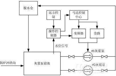 灰漿泵是根據(jù)前池液面的高度決定啟、停電機(jī)。這樣就存在兩方面問題:一方面為了適應(yīng)生產(chǎn)工藝要求,需要每天根據(jù)前池液位和沖灰管的需要不斷切換、啟停電機(jī),前池液位高度得不到很好控制,而且頻繁工頻啟動(dòng)電機(jī)對(duì)電機(jī)造成很大沖擊。灰漿泵工藝流程圖如下圖3所示: