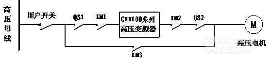 根據(jù)現(xiàn)場(chǎng)的額定參數(shù)和實(shí)際運(yùn)行工況,再結(jié)合我公司的CHH100系列高壓變頻器在其它工程應(yīng)用情況,我方提供的CHH100變頻器的旁路系統(tǒng)采用一拖一自動(dòng)方案,變頻器具有轉(zhuǎn)速跟蹤功能,變頻與工頻能夠自動(dòng)切換,其一次系統(tǒng)如下圖所示: