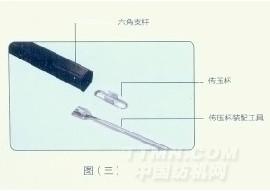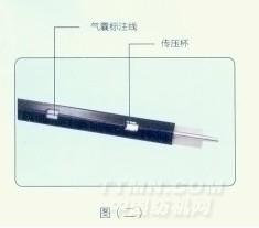 將清理完畢的支承管內外表面,氣囊管外表面,傳壓杯表面涂上石粉。然后按裝配圖要求將支承管一次套裝在氣囊管上,支承管上方孔應與壓力軟管上的縱向標志帶中心對齊(見圖二)。