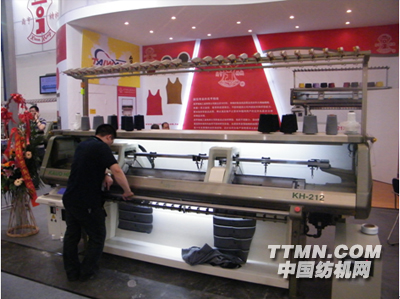 據周經理介紹,高亨精機于本屆展會亮相的產品是KF-300FF全電腦橫編織機。該設備在毛衣編織領域的特點尤其突出。設備采用一次成型技術,極大程度為用戶企業簡化了生產步驟,提高了生產效率。設備在運行中可通過機器自帶的陶瓷口電子天線,自動調整運行速度,無需人工調整。同時為提高產品自動化程度,實現企業要求的全電腦控制系統,設備操作界面采用觸控式彩色LCD顯示屏,工人可直接輸入花樣設計與程序動作指令,操作便捷,生產效率高。