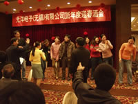 表彰大會結束后公司的員工為2005年度迎春聯歡晚會帶來了豐富多彩的文娛活動,這臺聯歡會的節目精彩紛呈、滿堂同樂。以姓氏作對聯、串歌、闖地雷陣將晚會帶入高潮。晚會互動性很強,可以說是每個人玩在其中,樂在其中,很多人都拿到了獎品,大家都期待著下次晚會!