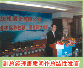 春風(fēng)和煦,鮮花盛開。四月十七日至二十八日我公司在信陽豫花園大酒店舉辦“2007年產(chǎn)品維護(hù)保養(yǎng)知識(shí)、質(zhì)量研討講座”。來自全國(guó)各地八十余名代表參加了講座。講座于十八日正式開幕。會(huì)上,公司董事長(zhǎng)牛玉生首先致歡迎詞,對(duì)來自全國(guó)地的代表表示熱烈地歡迎,并熱情地邀請(qǐng)代表到公司參觀指導(dǎo)。總經(jīng)理曹秀成向代表介紹我公司近幾年的發(fā)展情況和技術(shù)改造的進(jìn)展。總工程師陳立森向代表匯報(bào)了我公司新產(chǎn)品開發(fā)及與德國(guó)諾維佩勒公司合作生產(chǎn)的新型錠子等產(chǎn)品。十八日下午,總工程師陳立森向代表宣講產(chǎn)品使用維護(hù)、保養(yǎng)知識(shí)。天環(huán)公司經(jīng)理劉海播向代表講授鋼領(lǐng)工藝及使用情況,副總經(jīng)理胡傳勇向代表介紹了我公司質(zhì)量保證體系及公司產(chǎn)品質(zhì)量管理情況。最后代表互動(dòng)交流、踴躍發(fā)言,他們對(duì)我公司近年產(chǎn)品質(zhì)量的提升,對(duì)用戶們細(xì)致的服務(wù)表示贊賞。對(duì)公司產(chǎn)品提出了新的建議,祝愿雙方在以后的合作中取得雙贏。講座由副總經(jīng)理李榮輝主持。副總經(jīng)理唐質(zhì)明作總結(jié)性發(fā)言后,講座在熱烈的掌聲中圓滿結(jié)束。