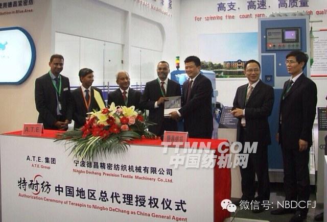 2014年6月16日下午,在上海新國(guó)際博覽中心,二年一次的《ITMA亞洲展覽會(huì)》現(xiàn)場(chǎng)中,寧波德昌紡機(jī)和印度A.T.E.集團(tuán)在德昌展位上舉行了“特耐紡”中國(guó)地區(qū)總代理代理授權(quán)儀式,正式將“特耐紡”高速紡紗專件推薦給廣大中國(guó)客戶。