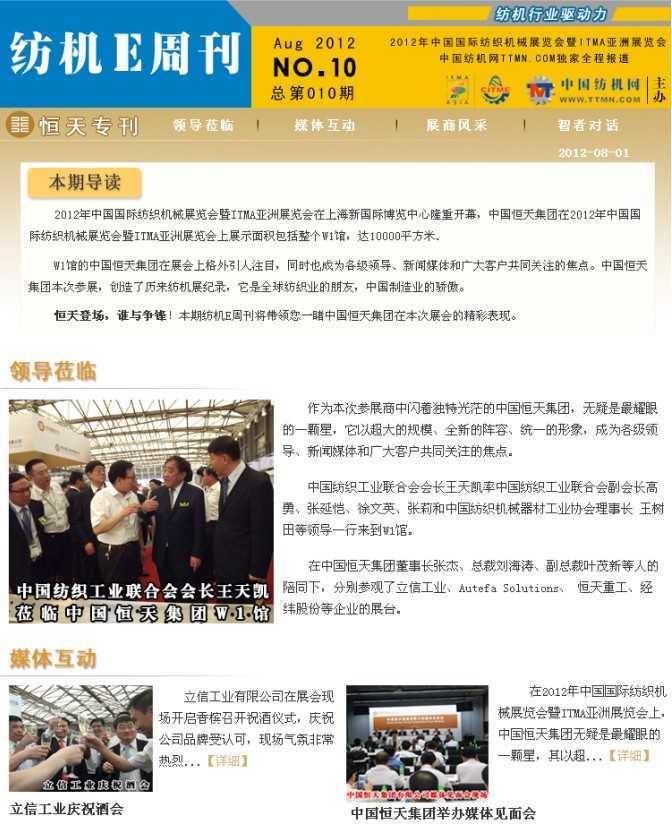 恒天集團企業專刊,針對恒天集團率領旗下子公司參加2012年國際紡機展的情況,只做了企業專刊,并在第一時間發送到其同行手中。這一專刊受到了恒天集團的肯定。