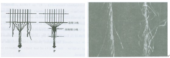 圖1 緊密紡與傳統(tǒng)環(huán)錠紡紗的形成比較    圖2 緊密紡與傳統(tǒng)環(huán)錠紡紗線毛羽比較