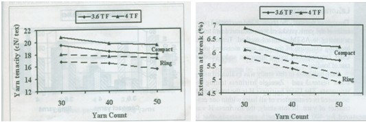統(tǒng)計分析還表明紡紗方法對紗線的強力有很大的影響,緊密紡紗的強力平均值要比普通環(huán)錠紗的強力平均值高17%。如果緊密紗的拈系數(shù)高及紗線支數(shù)較低,則緊密紗的強力平均值較高。如30英支緊密紗的拈系數(shù)在4時強力平均值較高,反之50英支普通環(huán)錠紗的拈系數(shù)在3.6時強力平均值較低。