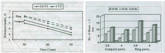 一般紗的毛羽特征以毛羽值H表示 ,是應(yīng)用烏斯特-3(或烏斯特-4、烏斯特-5)檢測1公分長度上紗線上毛羽數(shù)。ZweigleS3是用來檢測毛羽長度的分布。根據(jù)統(tǒng)計分析:紡紗方法、拈系數(shù)及紗支對生產(chǎn)的紗線的毛羽有顯著的影響。緊密環(huán)錠紗及普通環(huán)錠紗相比較見圖5 及圖6。紡紗方法(緊密環(huán)錠紡及普通環(huán)錠紡)對紗線的毛羽有顯著的影響。圖5 所示被測緊密紗的全部毛羽長度要比同支普通環(huán)錠紗減少26% ,這個結(jié)論是被測紗支較低 、拈系數(shù)較高的條件下得到的 。普通環(huán)錠紗上凸出的纖維數(shù)要比緊密環(huán)錠紗多也長的多,表明緊密環(huán)錠紡對纖維的聚集作用對纖維的有效的控制。與普通環(huán)錠紗相比較 3毫米及以上的毛羽,緊密環(huán)錠紡可減少 31%。