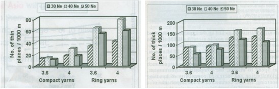 按2007烏斯特統(tǒng)資料規(guī)定,紗的任何布分如果粗于原紗直徑+35這部分即稱為粗節(jié),粗節(jié)對產(chǎn)品質(zhì)量及生產(chǎn)效率有負(fù)面影響。粗節(jié)的檢測是每1000米長的紗上粗節(jié)數(shù)的平均值。紡紗方法、紗支及拈系數(shù)等因素都會對粗節(jié)的產(chǎn)生有影響,特別是拈系數(shù)對粗節(jié)的產(chǎn)生有顯著的影響。不論是緊密紡還是普通環(huán)錠紡拈系數(shù)對粗節(jié)的產(chǎn)生的影響最大。40英支紗粗節(jié)較多、30英支紗及50英支紗依次次之。紗支高,拈系數(shù)低的條件下粗節(jié)數(shù)多。緊密紡紗要比普通環(huán)錠紗的粗節(jié)數(shù)少54%。