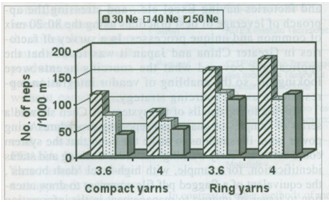 棉結(jié)大于正常棉紗直徑的+140%,以每1000米紗上的棉結(jié)數(shù)考核。對紗線及機器的性能進(jìn)行分析,紡紗方法及紗支對棉結(jié)的產(chǎn)生及棉結(jié)的多少有顯著的影響。緊密紡紗的棉結(jié)要比普通環(huán)錠紗的棉結(jié)數(shù)少28-61%,不同的紗支,不同的拈系數(shù)的結(jié)數(shù)不同,純棉低支紗及低拈系數(shù)時棉結(jié)數(shù)多。