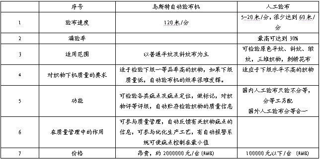 烏斯特驗布系統與人工驗布從目前生產實踐上看各有優缺點(見表1),但從發展的眼光看,烏斯特自動驗布機將逐步隨著時間發展,顯示出更多的優勢。