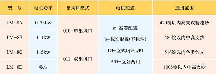 LM-8型節(jié)能吸棉風(fēng)機(jī)配置電機(jī)為A型0.75KW、B型1.1KW、C型1.5KW、D型4KW替代原細(xì)紗機(jī)1.5KW、2.2KW、3KW、7.5KW電機(jī)的吸棉風(fēng)機(jī),通過改變風(fēng)機(jī)的內(nèi)部結(jié)構(gòu),尤其是對(duì)葉輪采取整體結(jié)構(gòu)的改進(jìn),保持或接近原來的笛管真空度水平,從而使能耗降低百分之三十左右,節(jié)能效果明顯,該風(fēng)機(jī)結(jié)構(gòu)緊湊、運(yùn)行可靠、安裝方便和維護(hù)保養(yǎng)簡便。