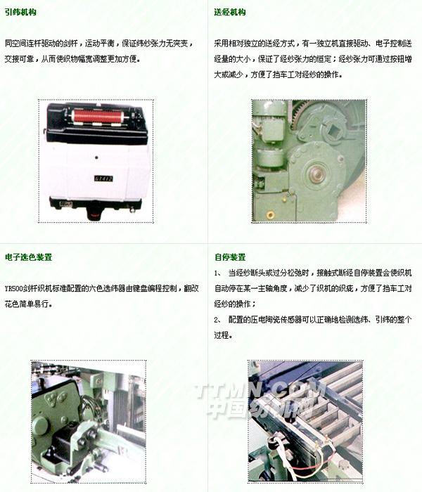 YR500劍桿織機是采用了電腦輔助設計、數控機床精密加工的新一代織機,該機型結構緊湊、功能齊全、操作簡便。織機重量分布均勻,高速運轉部位受力均衡,大大降低了織機運轉過程中的震動,是織造行業的首選產品。 織機的傳動由主電機通過單根V帶傳動電磁離合制動器,驅動筘座及劍桿的運動。同時,由微處理器檢測織機的運轉情況,控制電磁離合器的吸合與制動。 人機工程學。織機運用了人機工程學設計原理,便利了擋車工的操作,織機的所有功能皆由按鈕控制,液晶數字顯示器顯示,信號燈顯示斷緯 、斷經等停車故障,所有這些都方便了織機的操作與維護;加上連續不斷的氣流清除附在劍桿上飛花、雜質、保證了織物的品質。 |