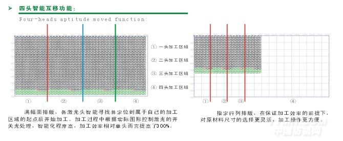 四個激光頭可根據加工圖形的不同自動計算最合理加工方案,同送料機相結合后形成全自動切割系統,是目前智能化程度最高的多頭激光加工設備,較傳統激光切割機更省料,效率提高4倍以上.