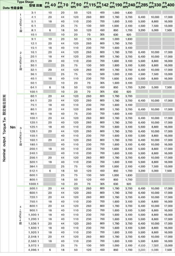 PS/WPS 系列精密行星減速機技術參數