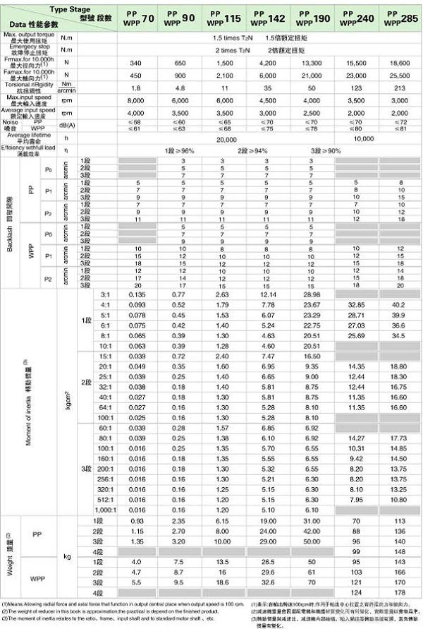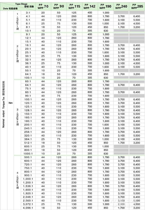 PP/WPP 系列精密行星減速機技術參數