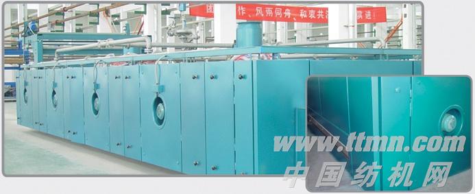 進布有平進或斜進布兩種,烘房采用三層穿布,積木式設計,每室烘房有二只循環風機、四只散熱器,噴風由上、中、下三處同時直接噴向織物表面。