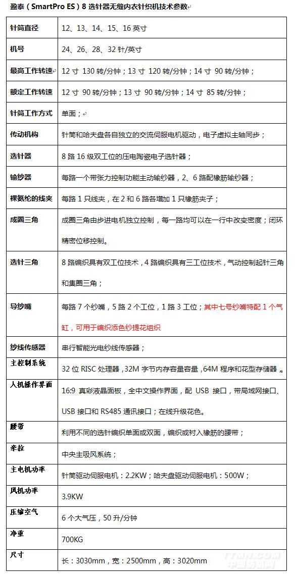 盈泰 SmartPro ES系列電子提花無縫內衣針織機是我公司歷經數年研發出來的應用全新技術的新一代無縫內衣針織機,它秉承高效、可靠、操作簡單、維護方便的設計思想,為用戶提供方便、快捷的無縫針織生產解決方案。SmartPro ES系列無縫內衣針織機采用8路壓電陶瓷電子選針器,配合高精度成圈馬達系統,適用與內衣、外衣、泳衣、運動衣和保健織物的生產,機器采用我公司專利技術的雙伺服獨立傳動結構,衣物扎口更加穩定美觀,產品的風格、色澤和手感完全可以和進口設備媲美。購買盈泰無縫內衣機,進入無縫針織的時代。