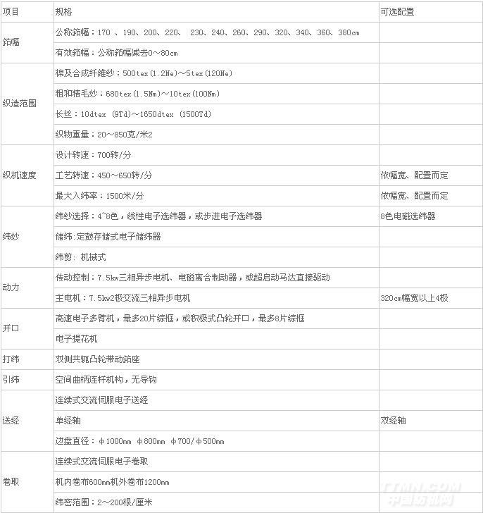 ★ 織機設(shè)計轉(zhuǎn)速700轉(zhuǎn)/分,最大入緯率1500米/分;筘幅范圍達(dá)170~380cm;可選配置方案多,能充分滿足各種不同品種織物的需要。