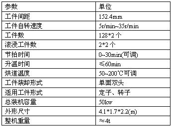 ★該設備采用小型漆槽升降裝置,工件(電機定子,轉子繞組)在連續旋轉狀態下完成滾浸、滴干、膠化和固化。工件掛漆均勻,鐵芯漆膜厚度一致,改善了絕緣材料導熱性,嚴格控制了每個工件漆的用量,大大放寬了烘道溫度場的均勻性,使產品質量相當穩定。