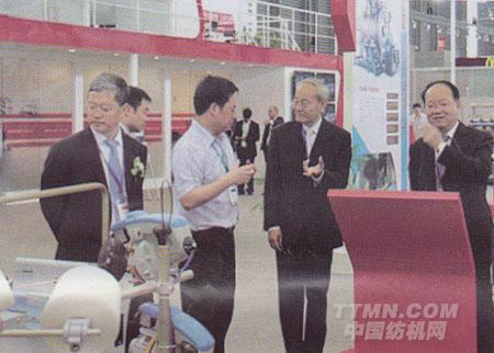 ●中國紡織工業(yè)聯(lián)合會名譽會長杜鈺洲(右二)和中國紡織工業(yè)聯(lián)合會副會長高勇 (右一)、夏令敏(左一)等領導在泰坦展位參觀。