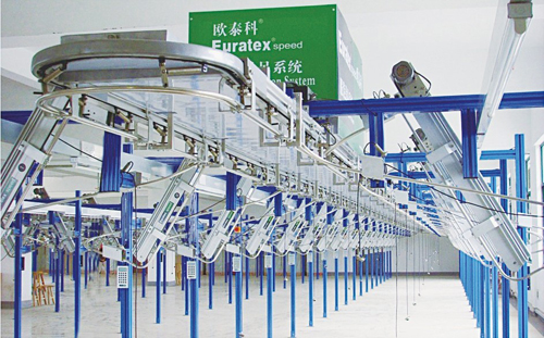 把生產一件衣服需要的所有裁片,掛在一個有數據分工的衣架上,該衣架在電腦的控制下,依次經過縫制的每道工序,一件衣服完成生產。