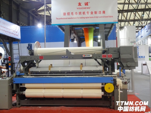 在展會現場我們看到友誠展示出了最新產品900SK聯動尋緯全數控毛巾劍桿織機。該產品采用全編輯、全數字化工藝編輯,性能優越、適應范圍廣、耗用小、易維修。功能強大的友誠?電氣控制系統通過數字化程序控制成功解決了老式機械起毛存在的各種不足,如能有效解決點動、停車高低毛問題。同時擁有開口、送經、卷取聯動尋緯(專利技術),無需人工放牙對毛,效果與正常織造一樣(俗稱傻瓜機),確保毛巾的高品質。