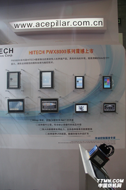 雖有如此之多的產品,但最引人關注的還是羅升企業新推出的HITECH PWX8000系列產品。HITECH PWX8000系列是HITECH最新推出的革命性人機界面產品,具有時尚的外觀,超高清晰的64k色TFT顯示,擁有全球最佳的圖形處理與觸控技術。采用Wince系統,支持C#語言及Net二次開發。強大的數據庫處理能力,可進行各種報表及數據查詢。
