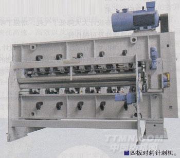 四板對刺高速針刺機應用于生產皮革基布、過濾材料基布、汽車用氈毯和壁毯、上上布復合膜等,填補了國內空白。其核心技術及創新點在于:四針板正位對刺,雙板正位對刺;在線調整針剌深度,開放式無曲軸箱,齒輪導向;人性化設計,針板氣囊夾緊便于更換;生產線配置中減少了每個單元機之間對布的牽伸,同等針剌強度要求下針剌密度下降;可用于預刺、主針剌、修而等。