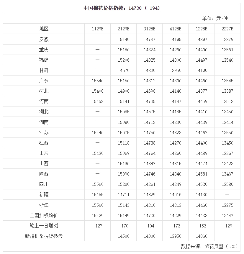 中國(guó)棉花價(jià)格指數(shù)(CC Index)及分省到廠(chǎng)價(jià)(8.9)