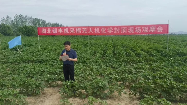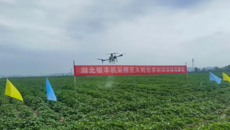 湖北銀豐機(jī)采棉無人機(jī)化學(xué)封頂現(xiàn)場(chǎng)觀摩會(huì)在荊門屈家?guī)X舉辦