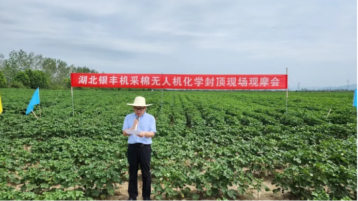 8月10日上午,雖已立秋,氣溫仍達(dá)36度。湖北銀豐棉花股份有限公司(簡(jiǎn)稱銀豐公司)在荊門市屈家?guī)X管理區(qū)吳家巷舉辦了機(jī)采棉無人機(jī)化學(xué)封頂現(xiàn)場(chǎng)觀摩會(huì)。國(guó)家工程院院士、我國(guó)著名的棉花育種專家張獻(xiàn)龍教授到現(xiàn)場(chǎng)觀看并提出指導(dǎo)性意見。