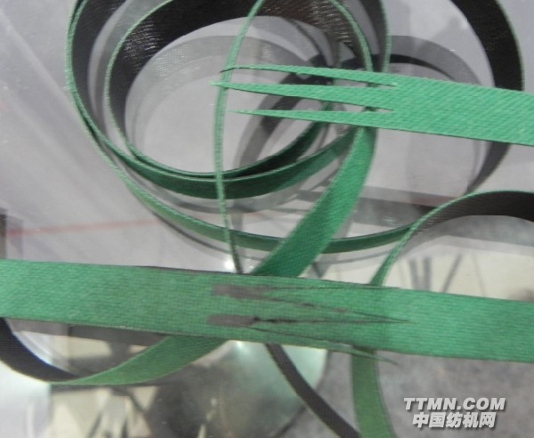 本屆上海紡機展上,無錫二橡膠展出了最新推出的WRB-105-W新型齒接錠帶,該產品以聚酯纖維織物、彈性體為主體材料。聚酯纖維織物與彈性體復合后的錠帶材質,可提高耐磨性能,彎曲疲勞性能,老化性能,穩定截斷定長尺寸,降低滑溜,提高傳動效率,以齒形平行對接的形式,可基本保持接頭厚度、接頭曲饒張力與帶體一致,無方向性。超薄、噪音小、轉速均勻、運轉平穩,所以比普通錠帶具有更高的摩擦系數,同設備同轉速運行情況下錠速比普通錠帶錠速高3%-3.5%。同比傳統錠帶可節電6%~7%,經多家實踐驗證基本達到預定效果。