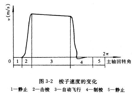 織機主軸回轉一周時間內,梭子經歷了靜止、擊梭、自由飛行、制梭、靜止幾個階段。