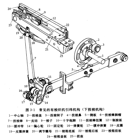 常見的引緯機構(投梭機構)有三種。根據傳遞投梭棒運動的作用力位置的高低分上投梭、中投梭、下投梭。