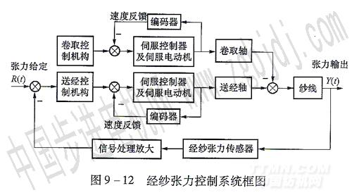電子送經機構由經紗張力檢測、信號處理及調節、織軸驅動等三部分組成。在紡織過程中,檢測出經紗張力的大小,而后反饋給計算機做信號處理,與給定的經紗張力比較后,控制送經電動機運動。電動機的轉速與經紗張力的誤差信號成正比,因此電動機的轉動就使經紗的張力被穩定在張力設定值。由此可見,這是一個恒張力控制系統,同時電動機的轉速又調節了送經量的大小,它又是一個位置控制系統。可以這樣認為,電動機在張力信號的作用下,以盡快速度實現運動,送出送經量(位置),而實現恒張力控制。在這個過程中,保證了恒張力條件下的送經采用交流伺服電動機對經紗張力的變化可以做平滑而快速調節。第一個負反饋環由光電編碼器檢測出伺服電動機的精確速度,對速度實現快速高精度控制;第二個反饋環為經紗張力控制,張力傳感器輸出的全幅經紗張力信號與給定值比較,差值作PID調節,控制送經紗電動機的起停或速度,保持經紗張力恒定。經紗張力控制系統框圖如圖9—12所示。