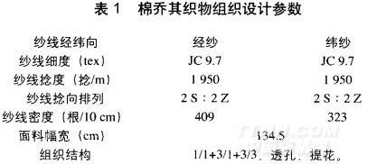 紗線的捻度、捻向和織物的強(qiáng)度、手感、外觀密切相關(guān)。為使印染整理后面料手感舒爽,有隱約的縐縮紋效果,在設(shè)E借鑒絲織喬其縐的設(shè)計(jì)思路,經(jīng)緯紗采用Jc9.7tex(捻度1950捻/m)強(qiáng)捻紗,并按2S:2Z排列,這樣在退、練、漂后由于強(qiáng)捻紗的退捻收縮產(chǎn)生皺縮效果,且相鄰兩種捻向的紗退捻方向相反產(chǎn)生相互作用力,使布面縐紋均勻細(xì)密,具有精細(xì)的外觀,并且給人舒適自然的感覺(jué)。