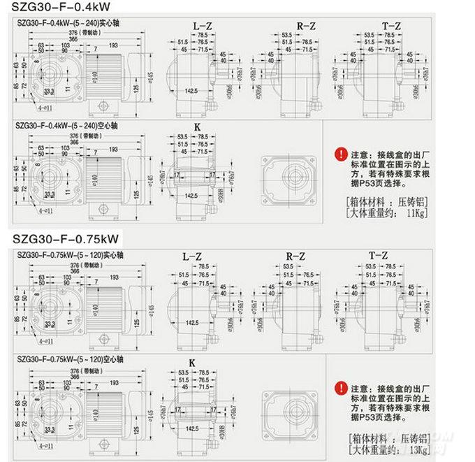 SZG-F直交軸中型可實現齒輪箱與電機的多種組合 我們不僅提供帶普通三相電機的山藤SEND產品,還可以提供帶單相電機、變頻電機,帶剎車,安裝編碼器等多種規格的山藤SEND產品,并且我們還推出了可與伺服電機配套的系列。