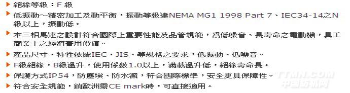 高崎臥式高效率電機軸端攻牙高崎高效率電機高崎電機一直不斷投注與研究開發高效能產品,使用最先進的電腦輔助設計儀器及噪音測試室等設備,借以提升各項產品設計和監測能力等```使得產品具有體積小.重量輕.低噪音.高效率.壽命長等優點,深獲得各界肯定;并用管理現代化.設備自動化來提高生產效率,降低成本,強化國際市場競爭力鋁合金外殼系列馬達馬力:0.25HP-20HP電壓范圍:50HZ:220V。380V/415V 60HZ:220V。380V/415V 絕緣等級:F CLASS IP55高效率EFF1接線盒可多邊安裝,90度旋轉,CE UL ISO9001認證。