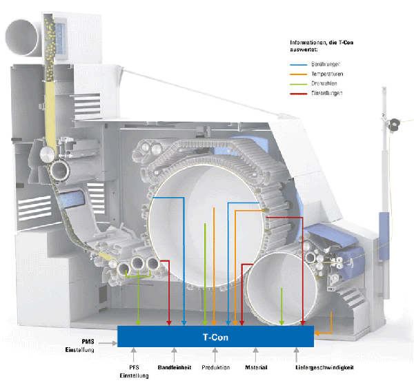 梳棉機產(chǎn)量的提高必定需要梳棉機的動作增加,這些動作會產(chǎn)生大量熱量。部分熱量隨著原料和吸風(fēng)被釋放。剩下的部分熱量導(dǎo)致梳棉機溫度明顯高于室溫。而溫度升高使梳棉機的部件產(chǎn)生不同程度膨脹,這對梳棉機工作元件的精確設(shè)定相當(dāng)不利。T-Con能夠基于工作狀態(tài)下的各個測量值客觀地計算梳理元件間的距離。計算結(jié)果顯示在梳棉機監(jiān)視器上,包括錫林和蓋板的梳理隔距,以及MULTI WEBCLEAN System的固定梳理元件與錫林的隔距。任何工程師都可以由此知曉當(dāng)前的實際設(shè)定,并使之最優(yōu)化。