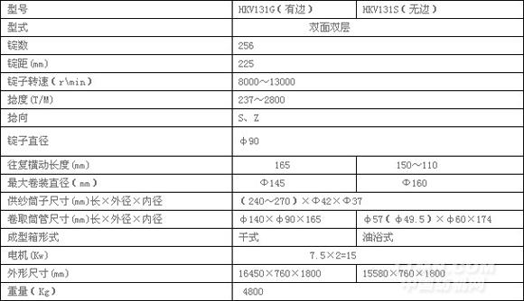 HKV131G(S)型倍捻機是一種適用以化纖、混紡等為原料的加捻設備,實現一轉兩捻,效率比傳統捻線機成倍提高,卷裝容量增大,萬米無接頭,加捻質量大幅度提高。該機具有性能價格比優越、錠速均勻、噪音低等優點。其中卷取成型方式有無邊卷繞(型號為HKV131S型)與有邊卷繞(型號為HKV131G型)兩種機型可供選擇。其最終產品廣泛應用于造織領域.