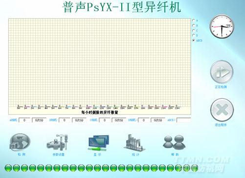 一、功能介紹:因收購棉花過程中的種種原因,使部分異纖維混入棉包;如丙綸絲、有色和白色尼龍、毛發、布片等幾十種,俗稱“三絲”。嚴重影響了棉紡廠的產品質量。為了降低人工撿“三絲”的成本,我們開發了PsYX-II型 普聲異纖機。本設備采用多臺高分辨率、多光譜、高速線陣掃描相機,采用特制的白色和紫外光源,合理設置的棉流檢測通道,集機、電、氣于一體的剔除噴吹結構,閾值自適應優化算法,高速高性能控制計算機,友善的觸摸屏人機界面等技術,使設備可以輕松識別和撿出頭發絲,丙綸絲,麻絲,塑料片等各種異纖,并保證設備長期穩定、可靠、高效的工作;其基本工作原理為由多臺高速、高分辨率線陣相機分別對透明的檢測通道進行多次掃,相機獲取的圖像數據經高速數據采集卡到高性能計算機,高性能計算機按照一定的算法,檢測每次掃描的數據,發現異纖維后,經過I/O控制卡控制電磁閥將其用壓縮空氣剔除到排雜通道