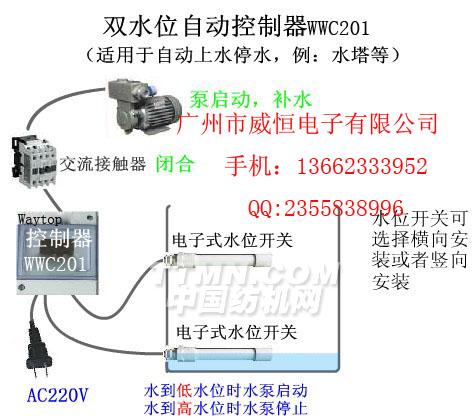 WWC201  當水到達低水位開關位置時,控制器內繼電器閉合,水上升時,繼電器繼續保持閉合狀態,直到水到達高水位開關位置時,繼電器斷開。水下降時,繼電器繼續保持斷開狀態,直到到達低水位開關位置時,繼電器合。如此不斷循環……